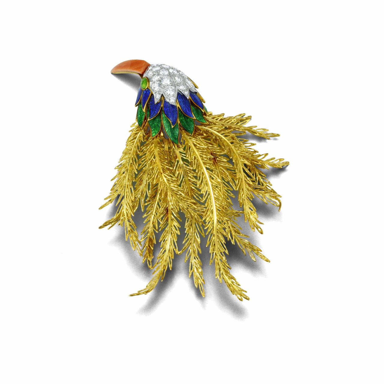 During the mid to late 20th century, creativity reigned and the use of different mediums predominated. This Mauboussin bird clip in 14-carat yellow gold and platinum is adorned with diamonds, enamel and coral and is an example of this evolution. It is signed and numbered and dates to 1969. Only one piece was ever created, which increases its collectability. It is accompanied by a certificate of authenticity by Mauboussin.