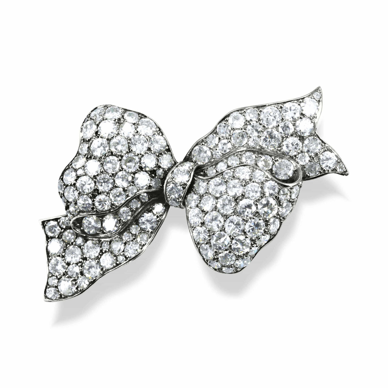 This diamond ribbon brooch, circa 1930, is set in platinum with mixed cut European and traditional cut diamonds. This is a splendid example of how the jeweller was able to imitate the design lines of a fabric ribbon, with structured loops and flowing ends. It’s a romantic piece that gleams with just enough character to allow the woman wearing it to radiate.