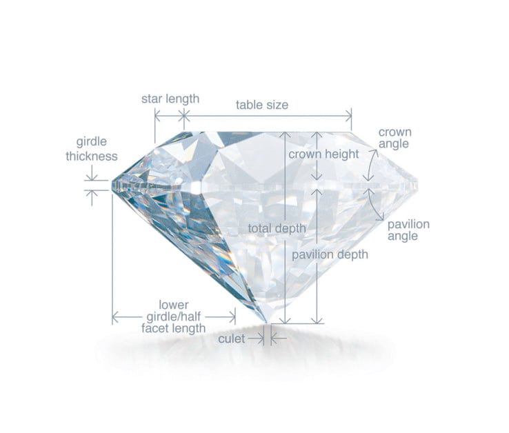 Cut refers to the angles, proportions, polish and symmetry of a stone. The way a diamond is cut determines how light enters and exits the stone, which affects its “brilliance” and “fire". A well-cut diamond reflects nearly all the light that enters it through the table (top) and crown (upper half) of the stone resulting in brilliance and fire. Brilliance is the amount of white light reflected from the diamond, and fire refers to the separation of white light into its spectral colors. A poorly cut diamond does not reflect all of the light which enters it. The two main categories of poorly cut diamonds are either shallow diamonds or deep cut diamonds.