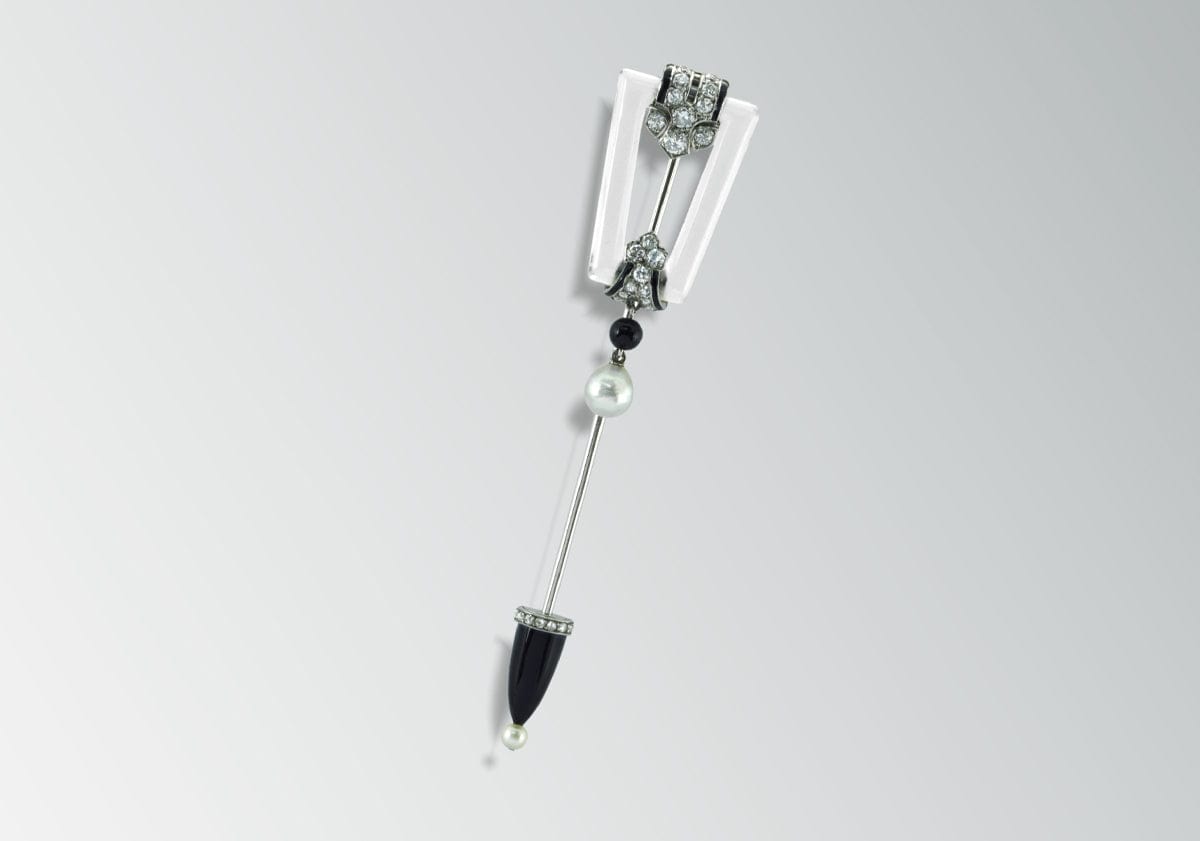 Very fashionable in the mid 1920s, jabot pins were creatively used to adorn lapels, neck lines and hats. A century later, they have evolved into a popular black-tie accessory for men. Comprising two separate decorative elements, joined by a pin, this distinctive jabot brooch, created in 1925, encapsulates Cartier's design aesthetic at the time. Showcasing crisp, geometric forms and high-contrast colours, carved rock crystal and a natural white pearl are juxtaposed with an onyx bead and black enamel detailing.