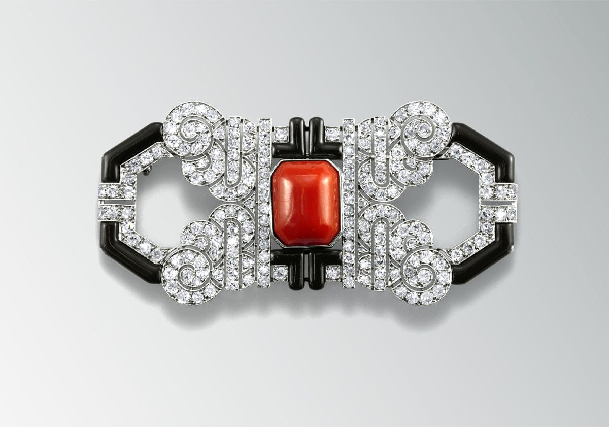 Numbered and fully documented with a trove of archival documents, the workmanship is impeccable and the Art Deco styling flawless, contrasting geometric swirls of diamonds with black enamel. The brooch also conceals a surprise: the antique coral cabochon can be unscrewed from its setting and replaced with another gemstone of the wearer’s choice.