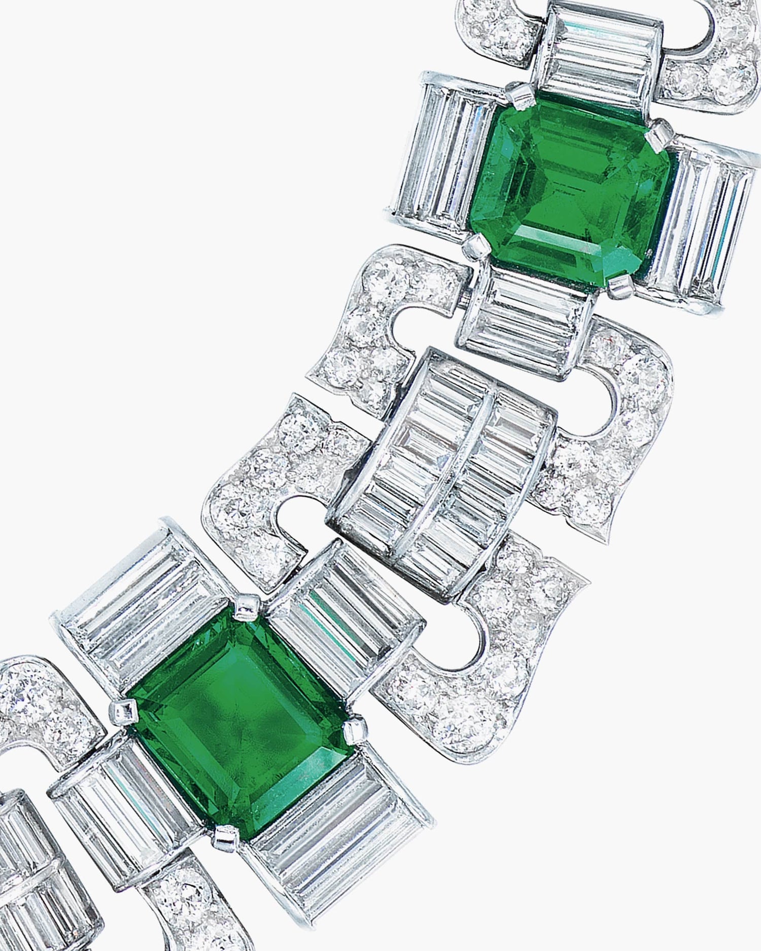 For more than four centuries, Mellerio has provided exceptional jewellery to some of history’s most powerful families. With patrons including Marie de Medici, Queen Marie Antoinette, Queen Isabella of Spain, and Empress Josephine, wife of Napoleon, Mellerio knew how to convey strength and beauty through bold design. Centering a vibrant Colombian emerald, the pendant frames the stone with chevrons and circles, geometric designs inspired by the hexagonal shape of the emerald. Worn as a sautoir with an elaborate diamond chain echoing the design of the pendant, the jewel is beautiful and impactful. The ingenious design allows the necklace to be taken apart and worn as three bracelets, or as a shorter necklace with or without the pendant, bringing unusual versatility to the magnificent jewel.