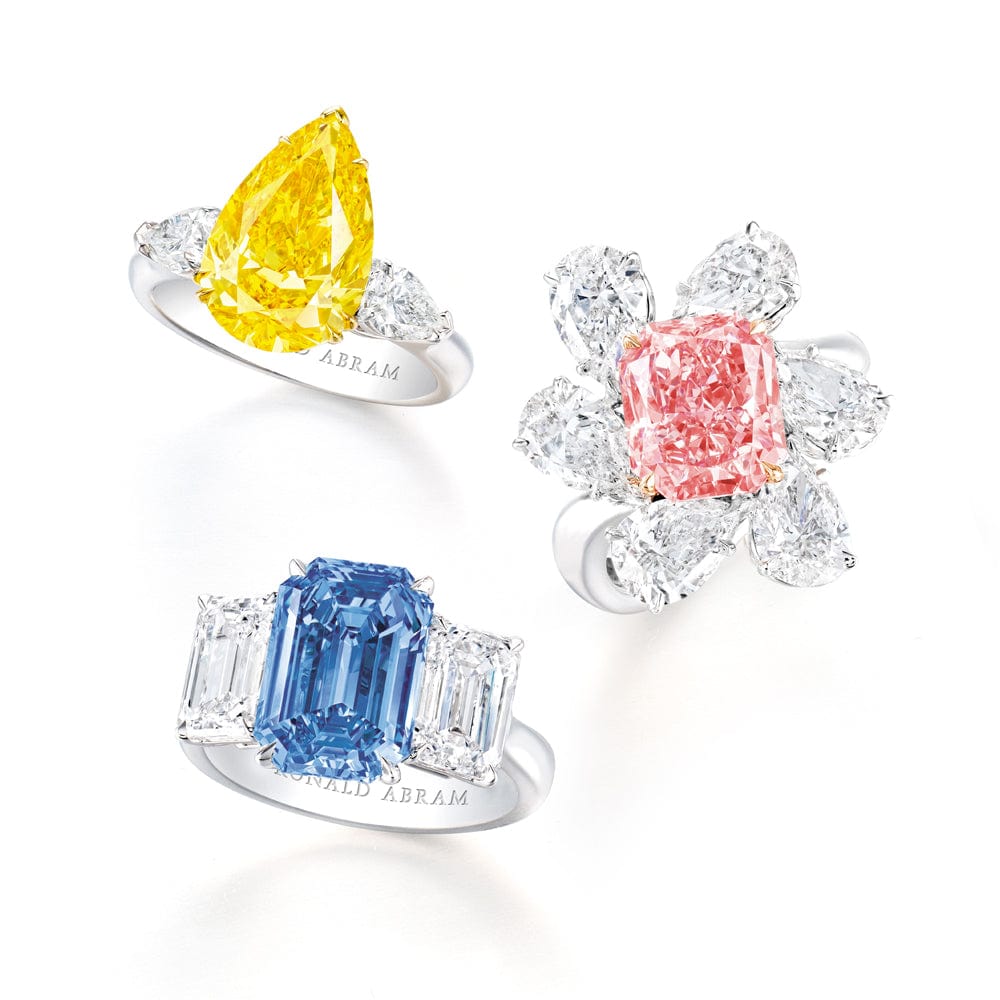 Ronald Abram unveils a trio of exceptionally rare fancy vivid internally flawless coloured diamonds. Featuring a 3.42 carat Fancy Vivid Pink Diamond, a 3.88 carat Fancy Vivd Blue Diamond, and a 3.63 carat Fancy Vivid Orangy Yellow Diamond.