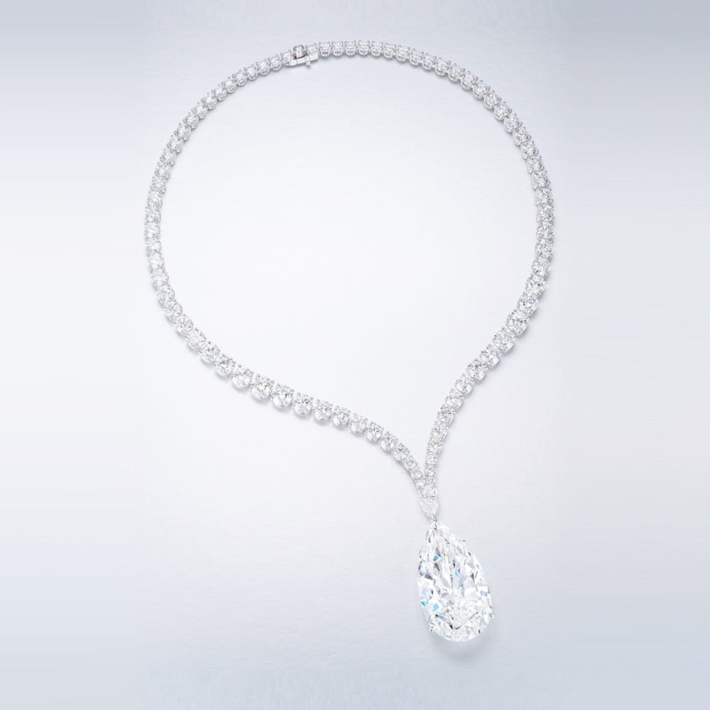 Ronald Abram unveils the Snowdrop Diamond. A magnificent 73.68 carat, internally flawless, pear-shaped diamond suspended from a one-of-a-kind necklace.