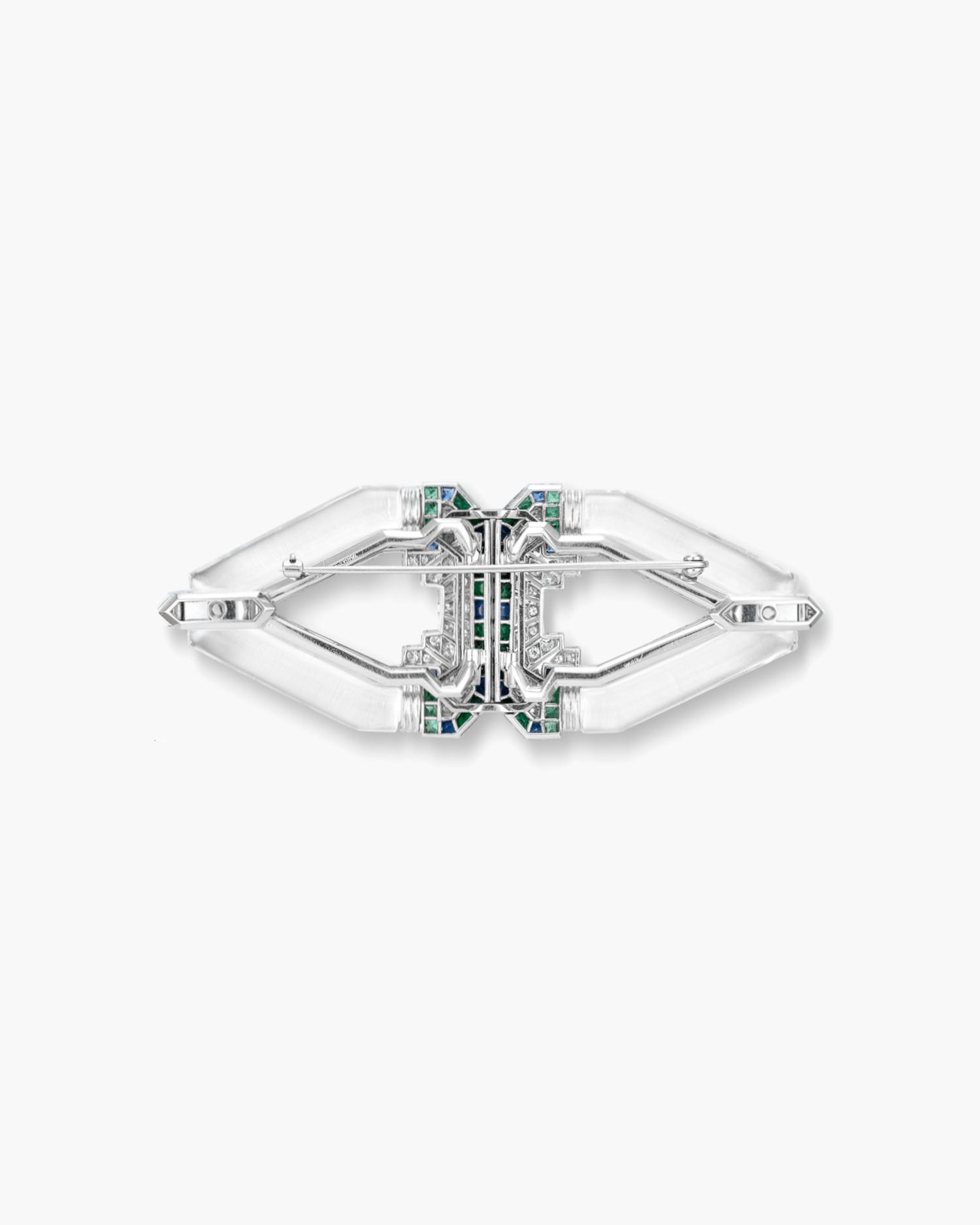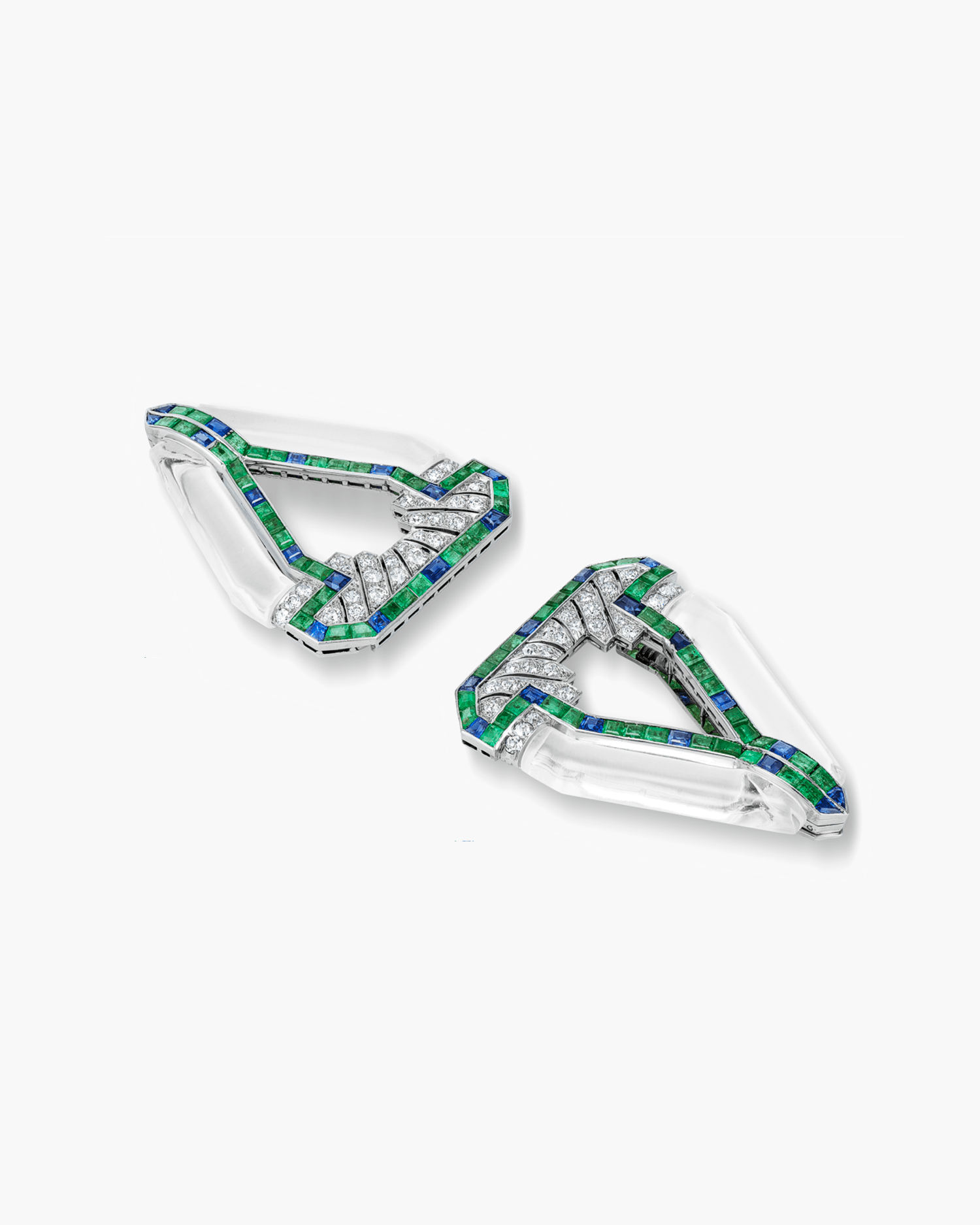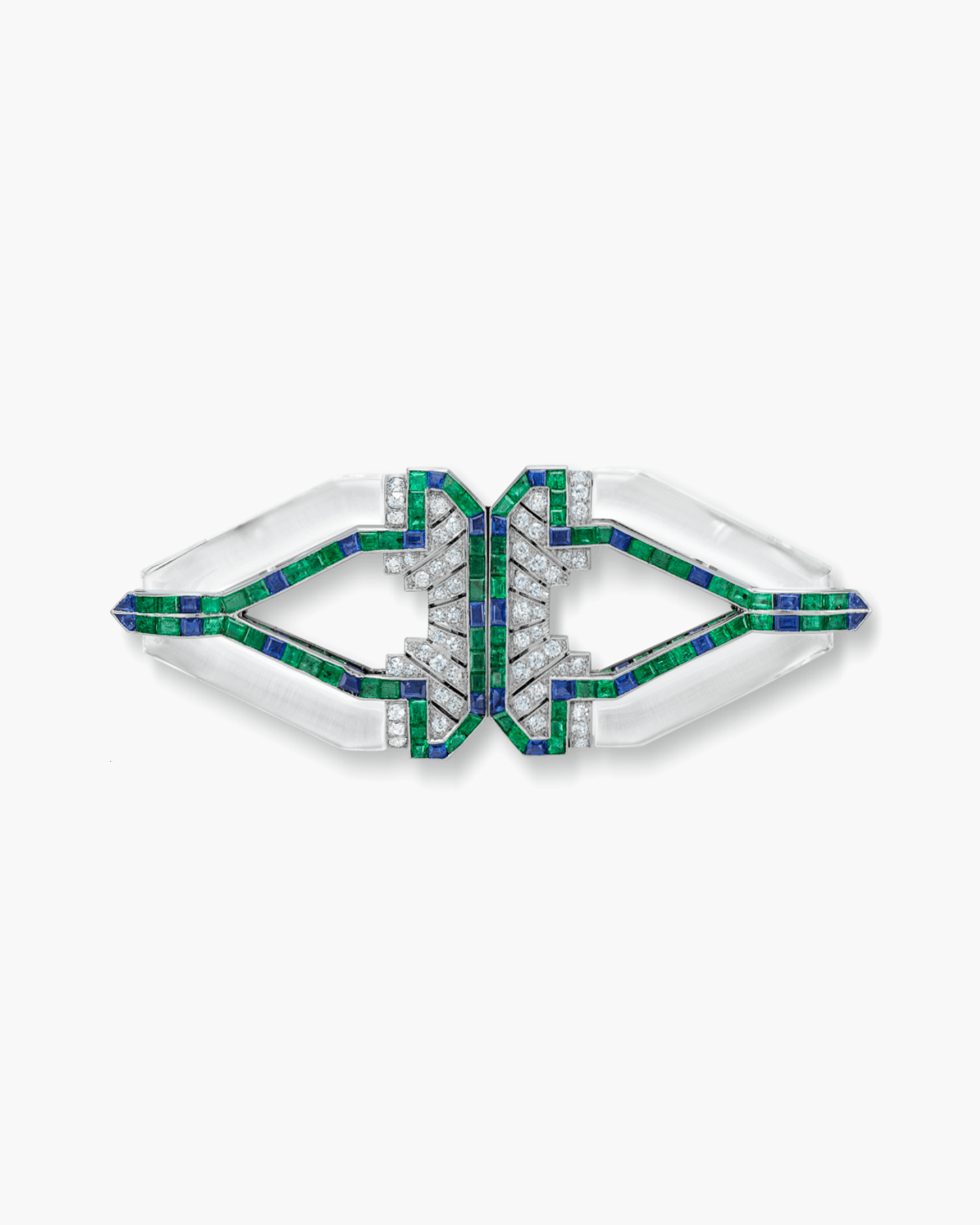Art Deco Rock Crystal, Diamond, Sapphire and Emerald Double Clip Brooch by Raymond Yard