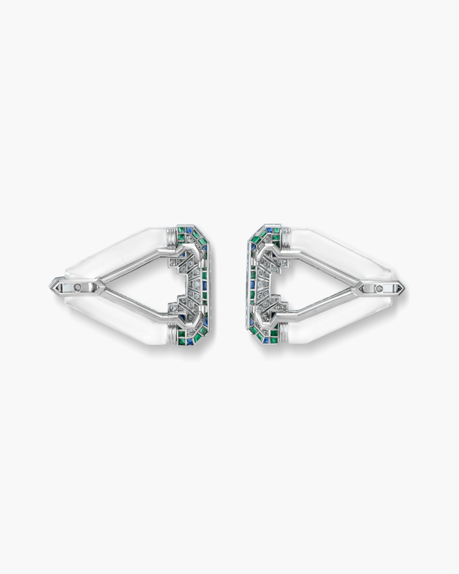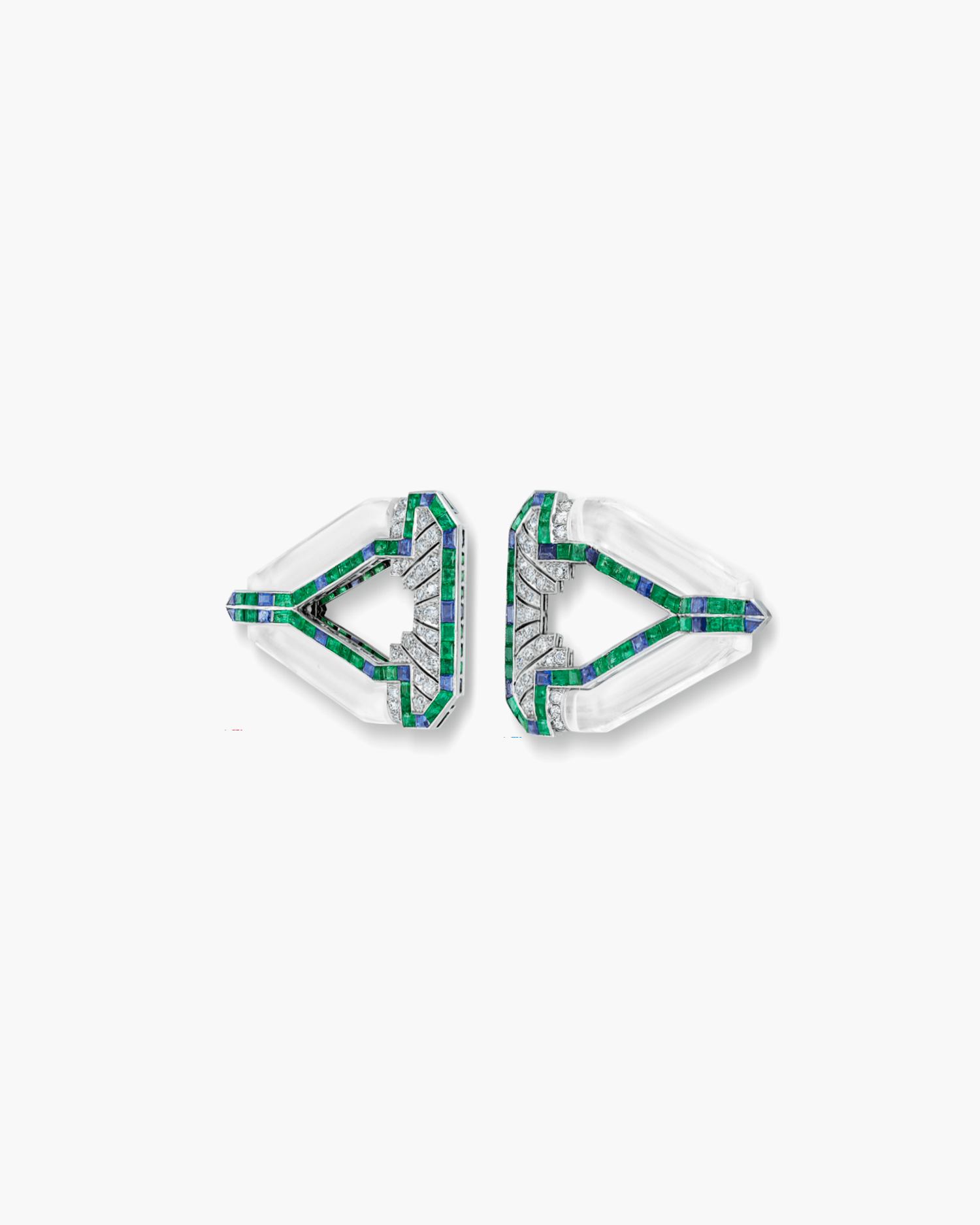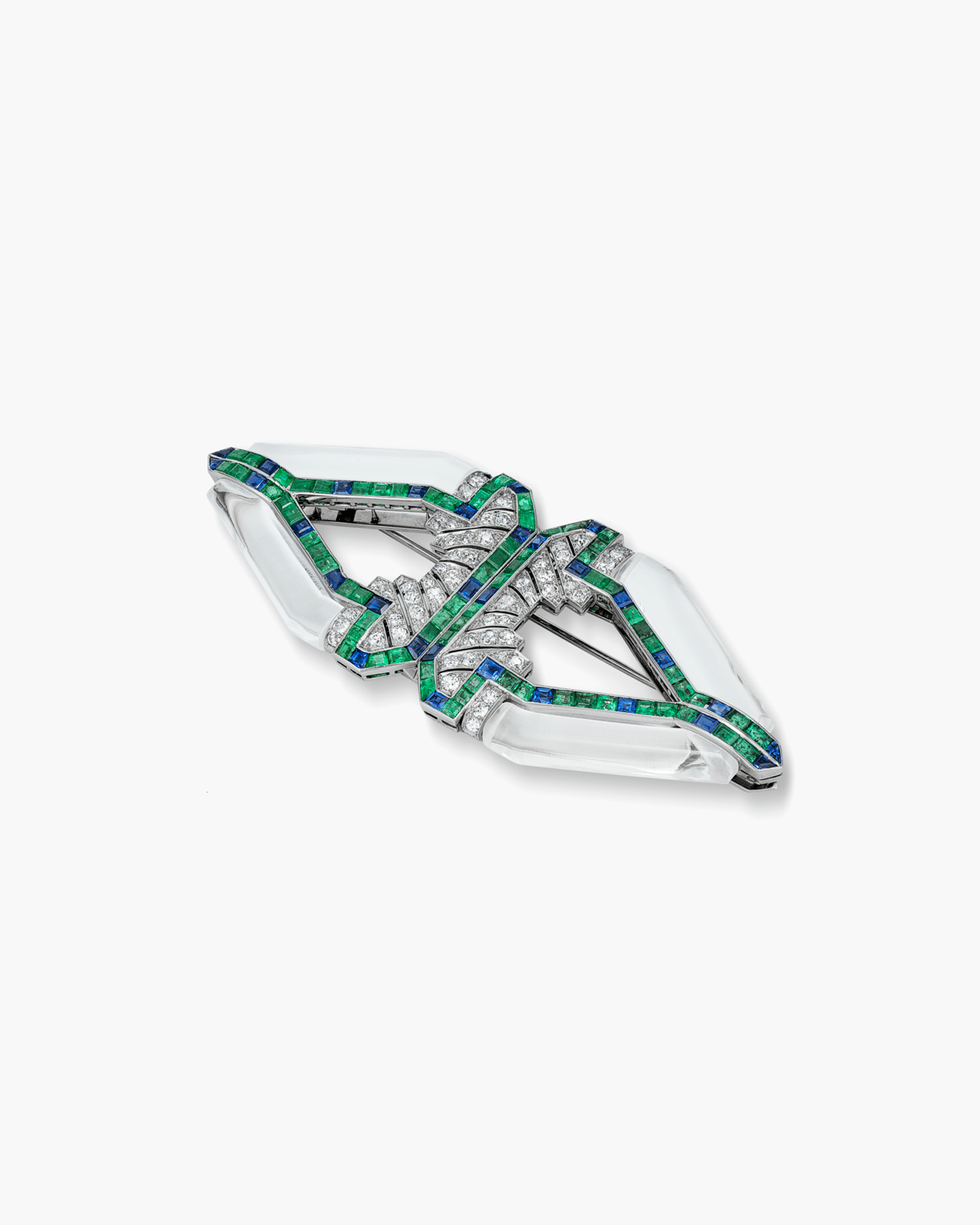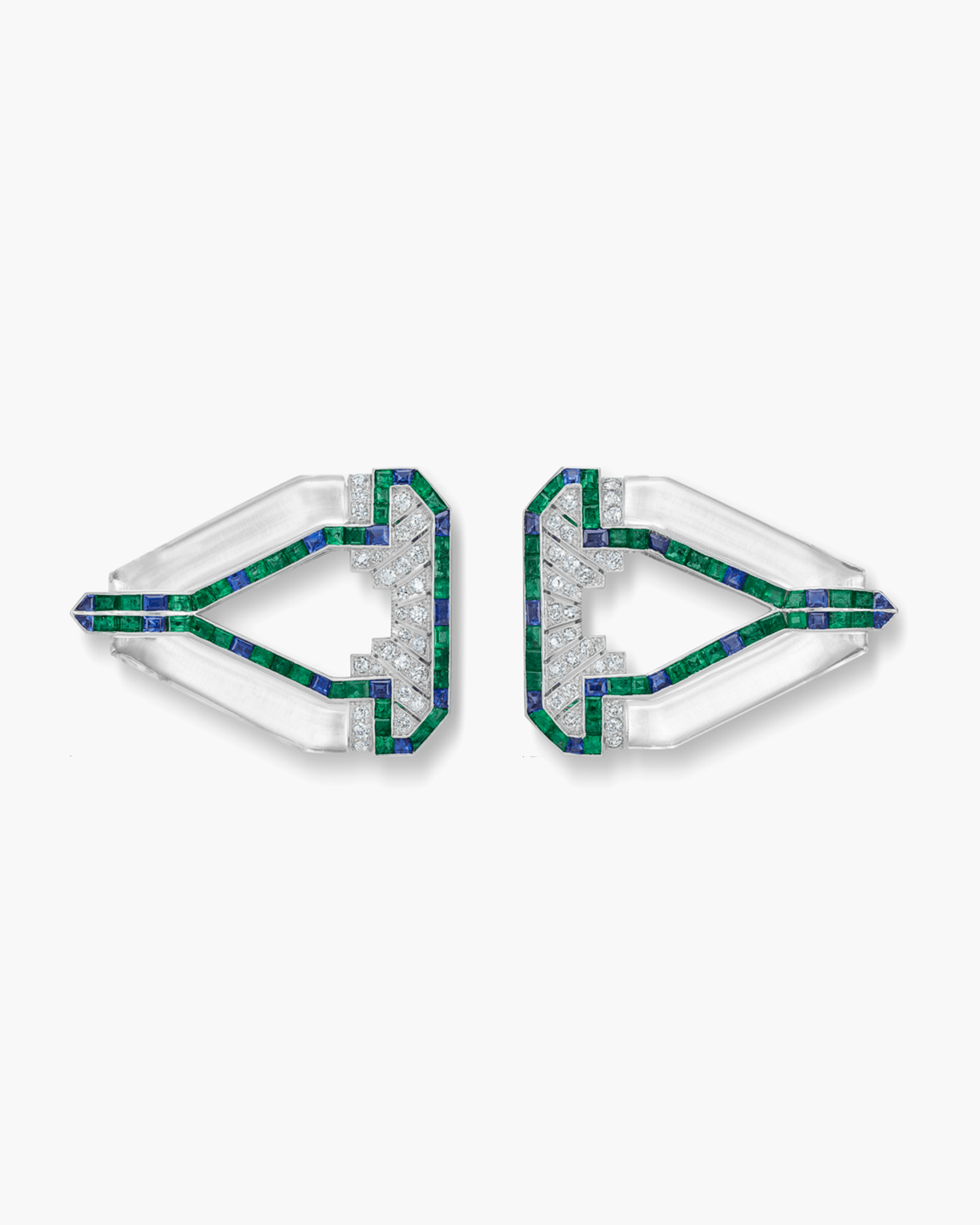 Art Deco Rock Crystal, Diamond, Sapphire and Emerald Double Clip Brooch by Raymond Yard