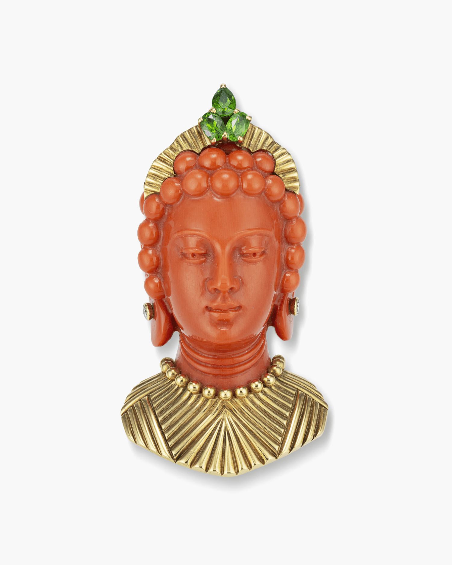 Carved Coral, Diamond and Peridot Bodhisattva Head Clip Brooch