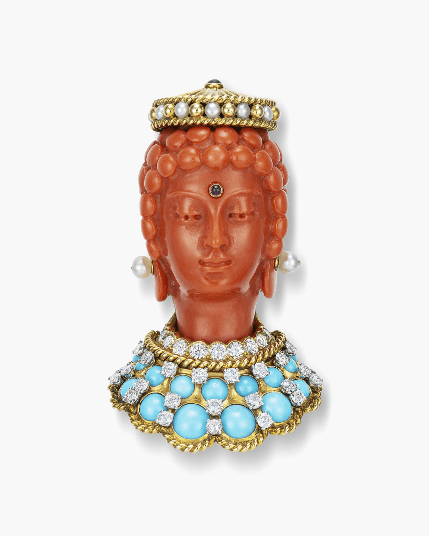 Estate Carved Coral, Turquoise and Diamond Bodhisattva Head Brooch by Cartier